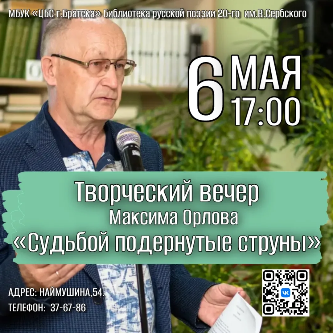 6 мая в Братске состоится творческий вечер члена Союза писателей России Максима Орлова. Мероприятие под названием «Судьбой подёрнутые струны…» пройдёт в библиотеке русской поэзии XX века имени В.С. Сербского (Наймушина, 54). Начало в 17 часов.